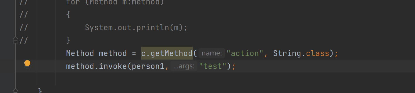 就是这两个简单的代码,然后就可以访问person类里边的函数方法了,这里的getMethod()方法和那个getConstructor()方法类似,都是必须得告诉一下我们使用的是啥类型的参数。这里的invoke()方法在这里就是触发的意思,就是触发person里边的action方法,这里传的参数和上面的set()是一个意思,就是第一位得传实例化的对象,然后第二位传参数(可以在输出函数名的时候进行查看,idea会告诉你该传什么参数)